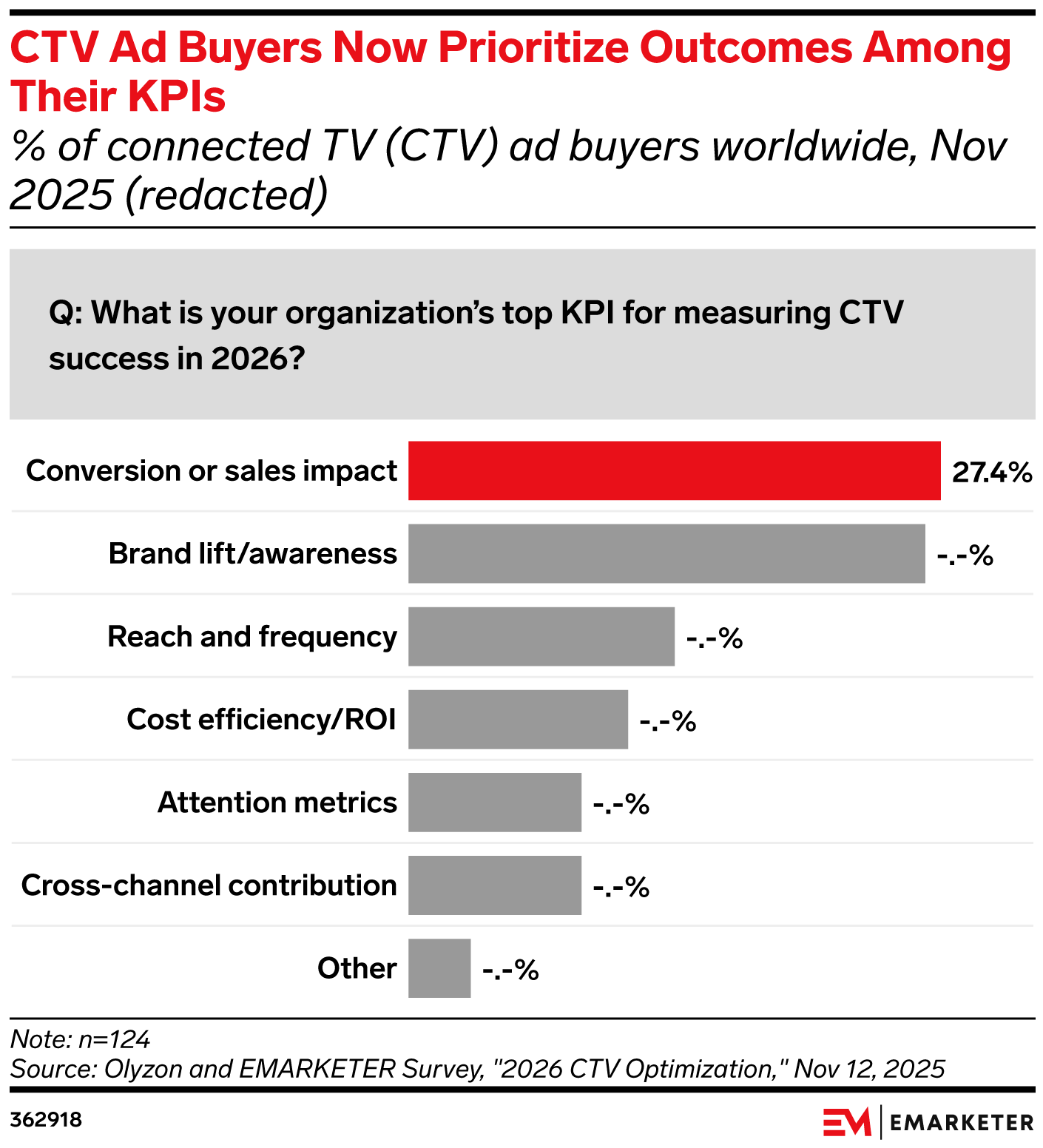 Key Stat: More than one-fourth (27.4%) of marketers worldwide use conversions or sales impact as their top KPI for measuring CTV success.