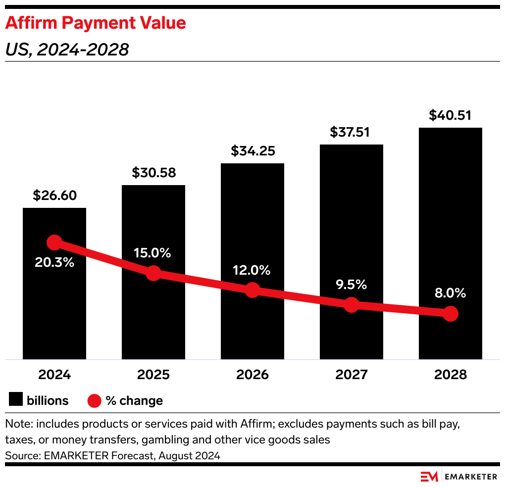 Diversifying into new categories, launching new markets, and pushing the debit card has gotten Affirm to a strong standing, which will likely continue through 2025. We forecast Affirm’s US total payment value for the year will total $30.58 billion.