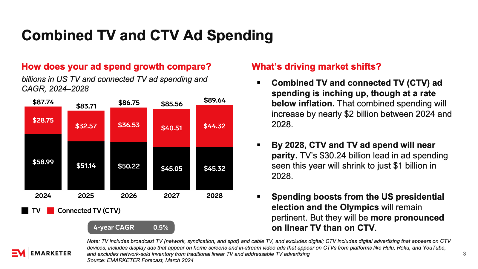 AI-enabled CTVs also create a fertile ground for targeted, immersive advertising on home screens and in-stream video ads—helping brands connect with consumers. We forecast that combined TV and CTV ad spending will increase by nearly $2 billion between 2024 and 2028.