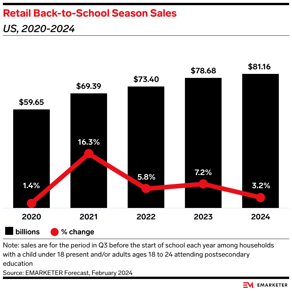 The forecast: Back-to-school sales will rise 3.2% year over year (YoY) this year to $81.16 billion, according to our forecast. While that’s a slowdown from last year’s 7.2% gain, it is in line with historical norms.