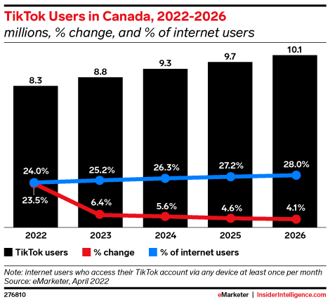 KEY STAT: There will be 8.3 million TikTok users in Canada in 2022—1.1 million more than we expected in our forecast from last fall.