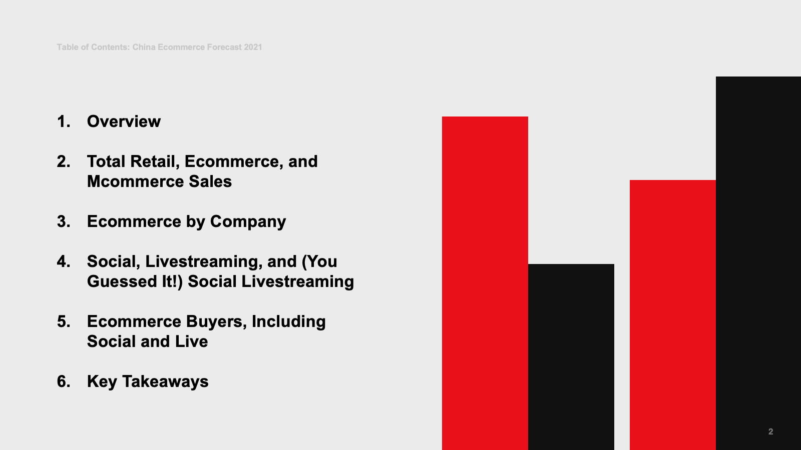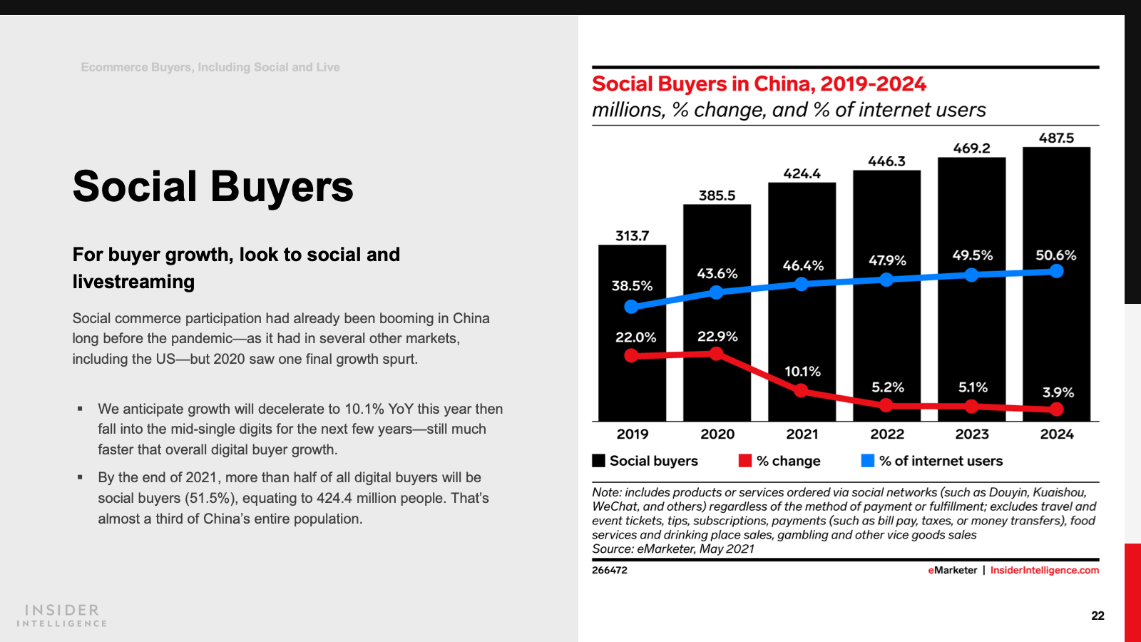 WHAT’S IN THIS REPORT? This report features our latest China forecasts for retail sales, retail sales by product category, retail ecommerce, mcommerce, social commerce, livestreaming commerce, livestreaming social commerce, digital buyers, and ecommerce by company.