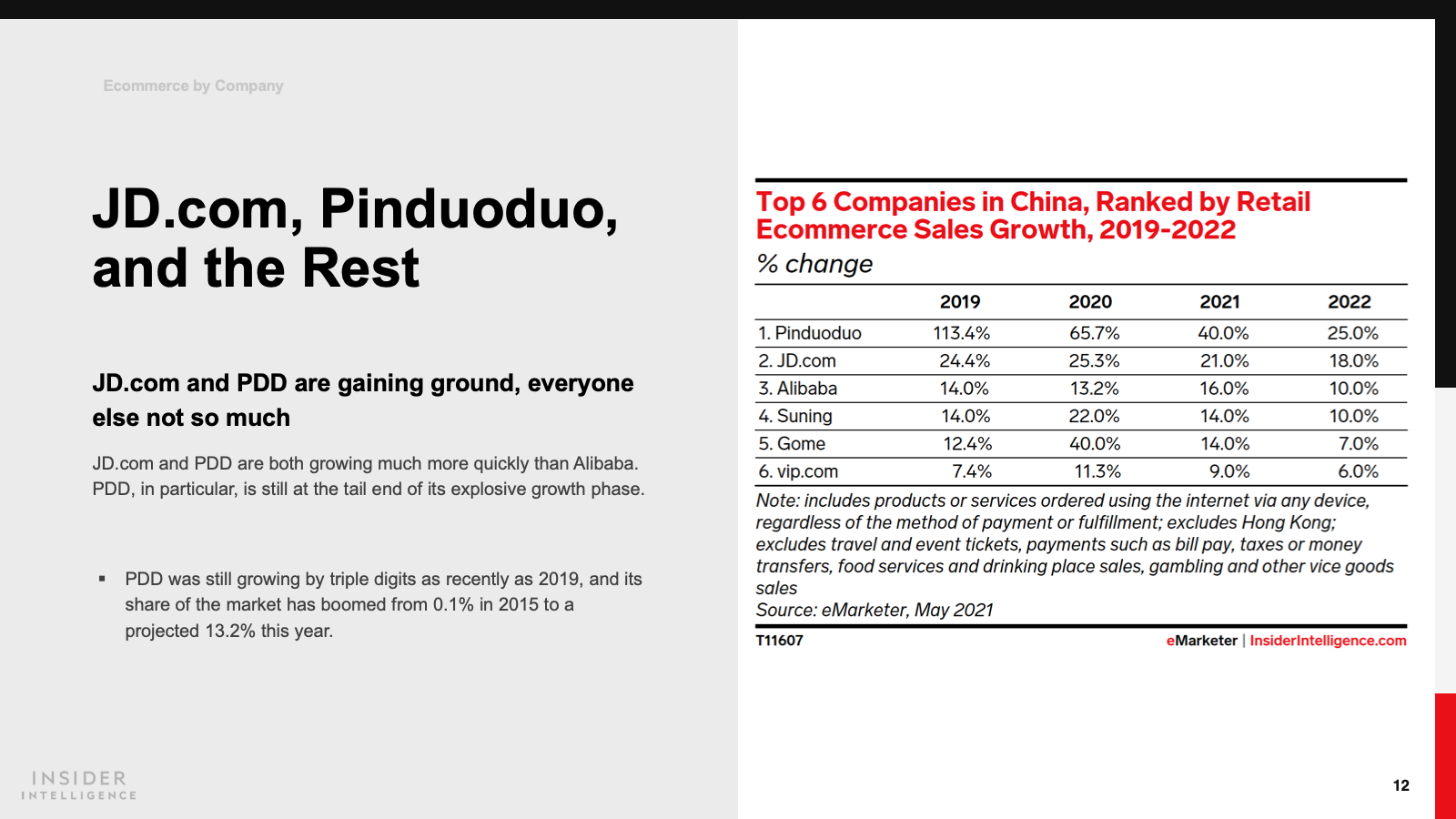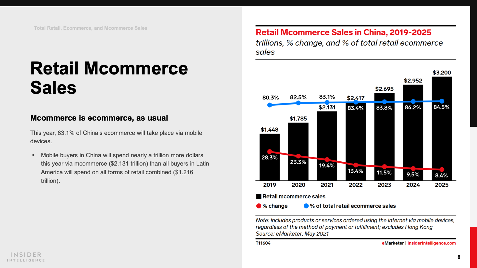 KEY STAT: Retail ecommerce sales in China increased by 20% last year, less than the 27.5% expansion we previously predicted. This year, we anticipate a continued deceleration, down to 18.5% growth.