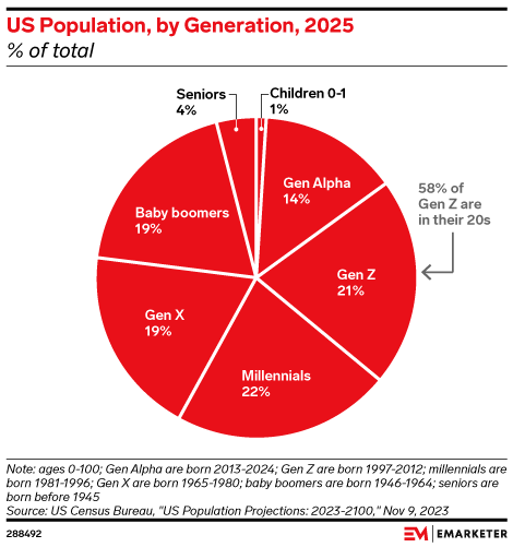 Over half of Gen Zers (58%) will be in their 20s in 2025, according to the US Census Bureau. The oldest are now 27, and about 72% of Gen Zers ages 20 to 24 were in the workforce as of November, per the US Bureau of Labor Statistics. Meanwhile, Gen Alpha, which we define as those born between 2013 and 2024, will comprise 14% of the population in 2025.