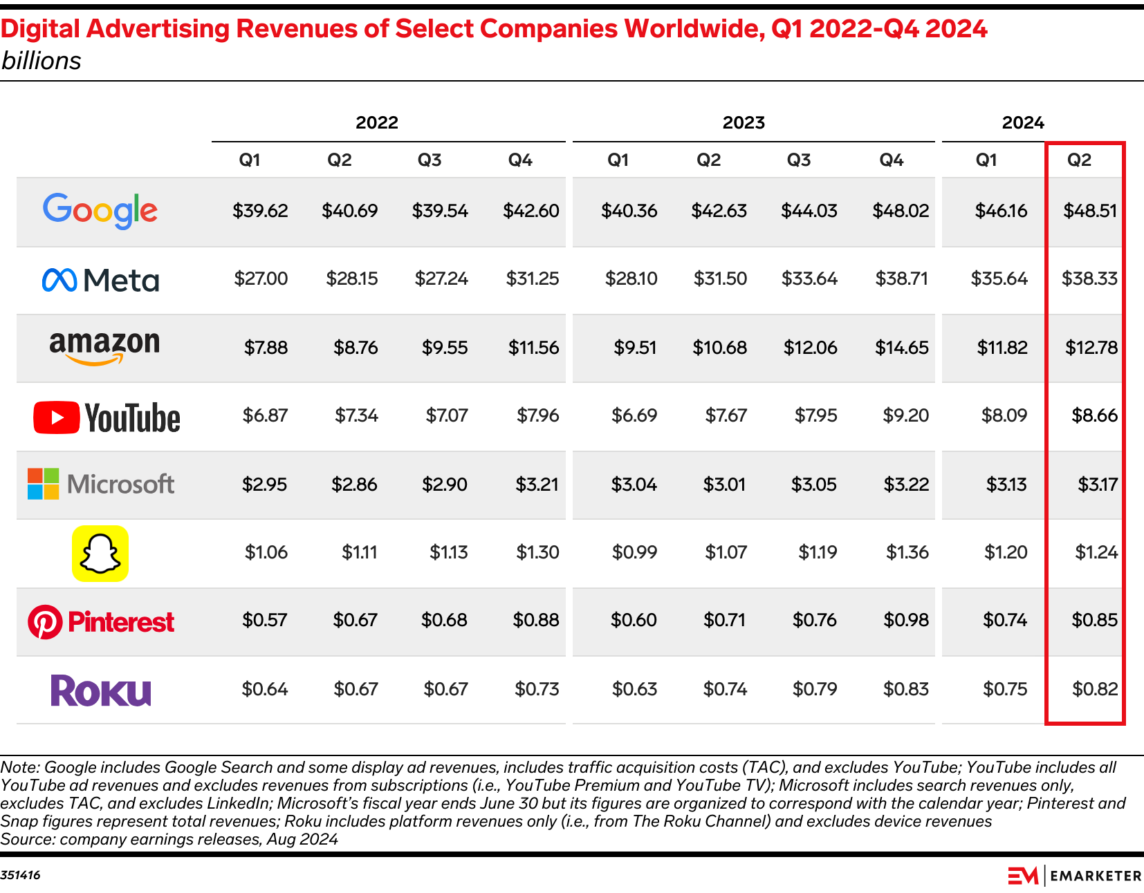 In this report, we’ll contextualize our coverage of select companies’ Q2 digital advertising revenues across three key categories: Search (Google, Microsoft); Social (Meta, LinkedIn, Pinterest, Snap); Connected TV (Netflix, YouTube, Disney, Roku, Prime Video) ; and Retail Media (Amazon, Walmart).
