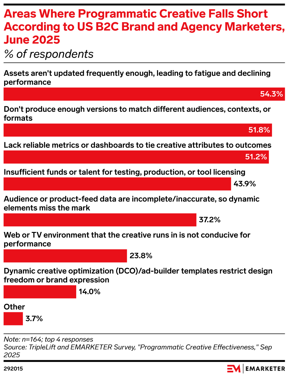Cost pressure and creative volume demands are the primary drivers. According to IAB, 64% of advertisers cite cost efficiency as the top benefit of AI in advertising, a sharp jump from fifth place in 2024. Keeping creative fresh across programmatic, social, CTV, and retail media channels requires more variants than manual production can sustain.