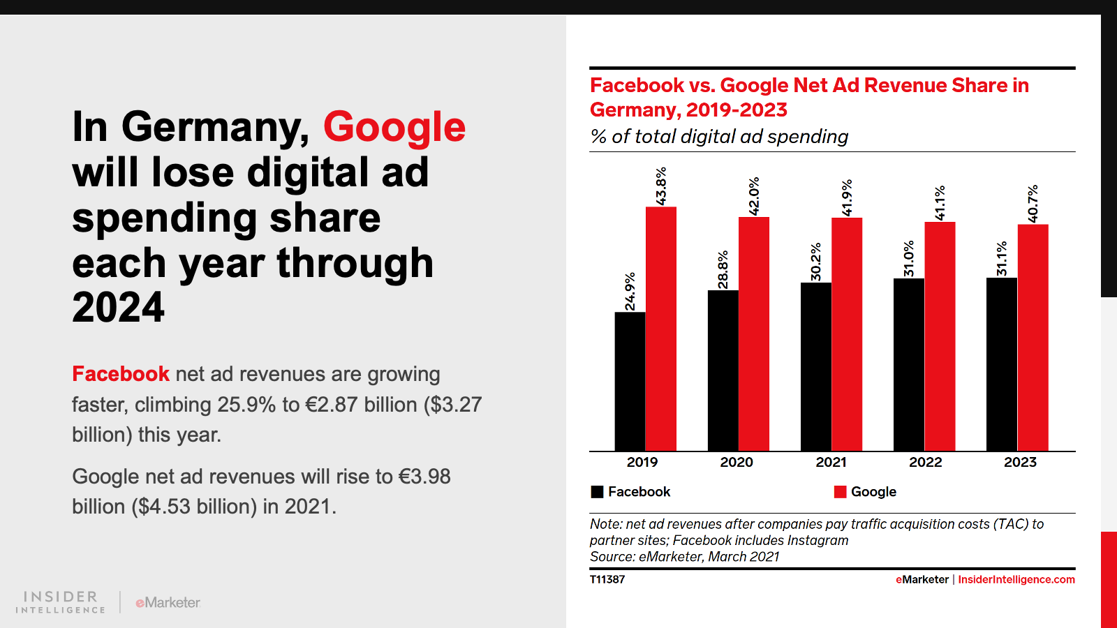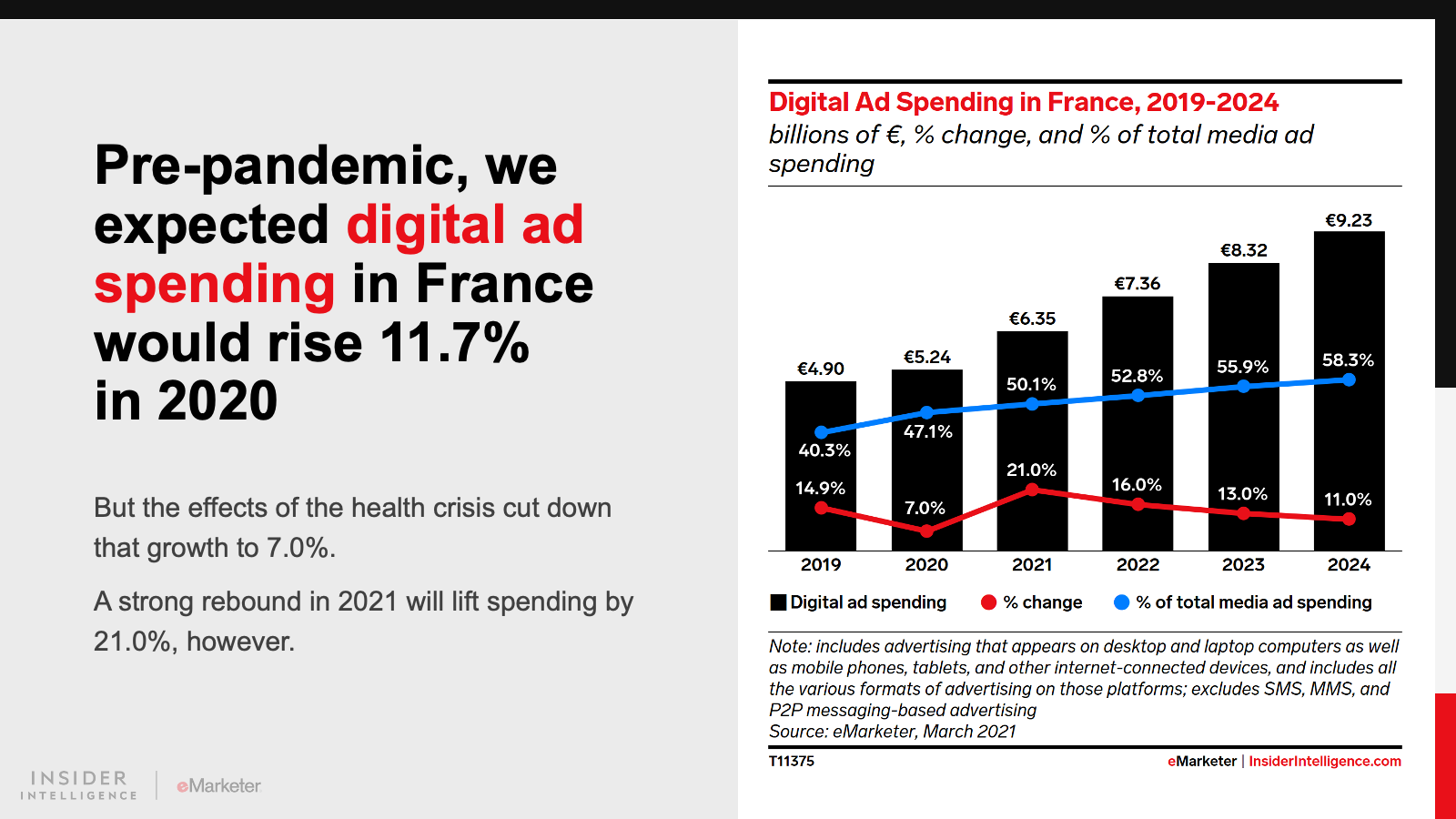 In Germany, as in France, digital ad spending growth was rather anemic in 2020, at 8.0%, compared with our pre-pandemic expectation of 10.0%. But it will recover dramatically this year. We’ve revised our 2021 estimate upward, from 9.0% to 20.0% YoY.