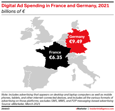 KEY STAT: In 2021, digital ad outlays in both countries will jump by double-digit rates, to reach €6.35 billion ($7.24 billion) in France and €9.49 billion ($10.82 billion) in Germany.