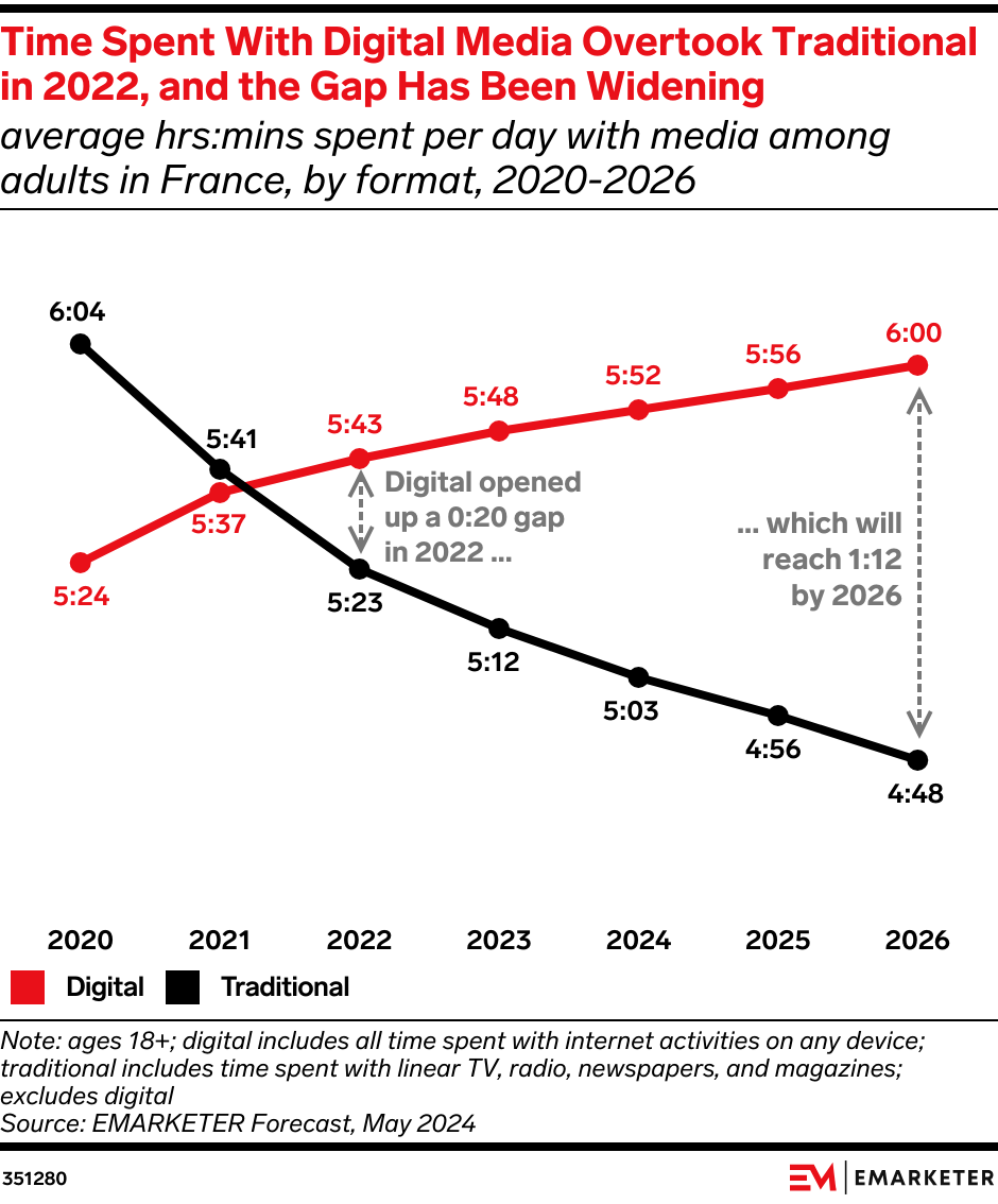 Total media time spent is falling slowly in France—it won’t drop below pre-pandemic levels until 2026. Meanwhile, digital’s proportion of total media time is gaining as traditional media falls out of favor.