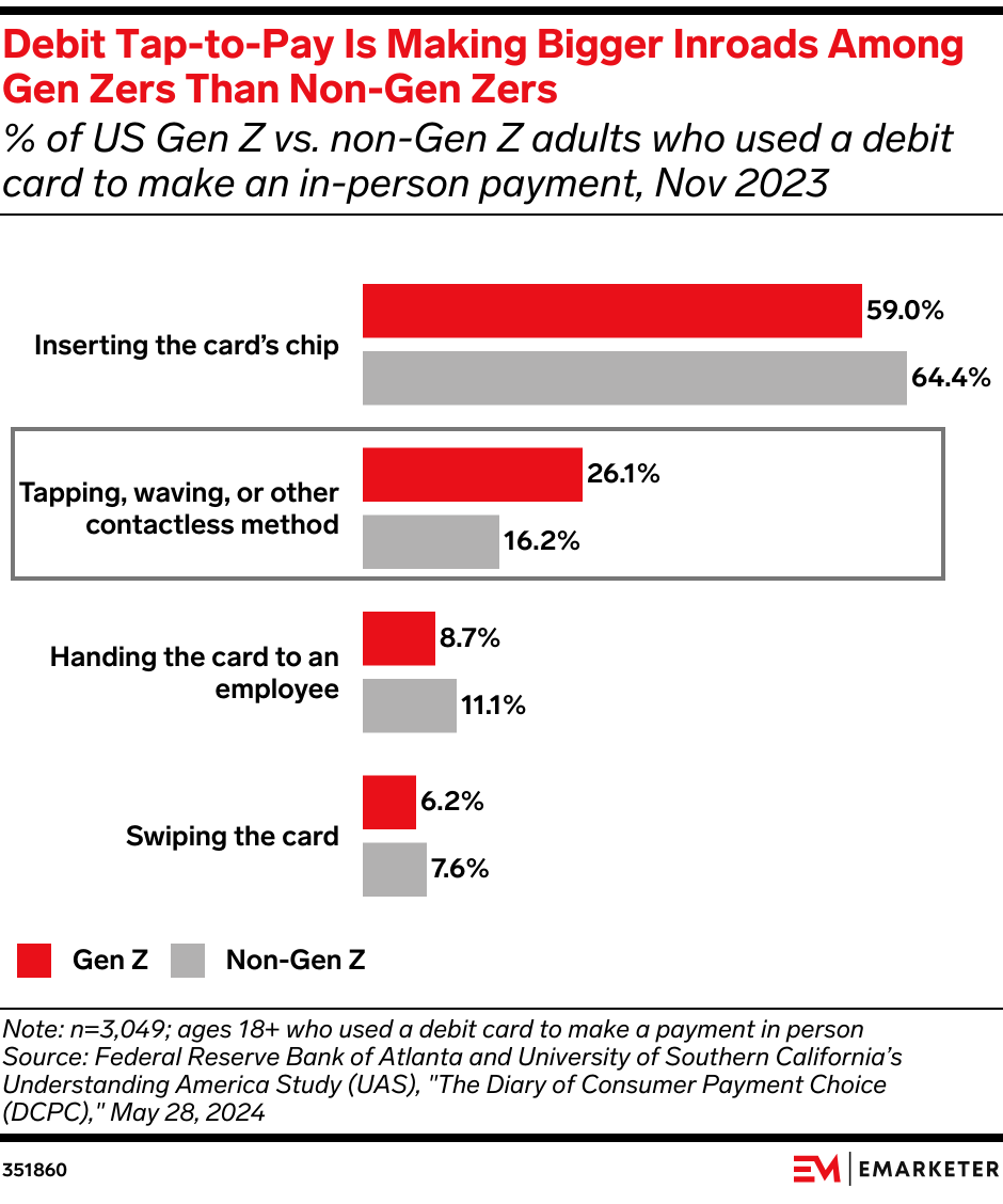 Key Stat: Gen Zers are 61% more likely than other generations to use tap-to-pay technology for debit transactions, per October 2023 Federal Reserve Bank of Atlanta survey data—just one way this generation is reshaping how consumers pay.