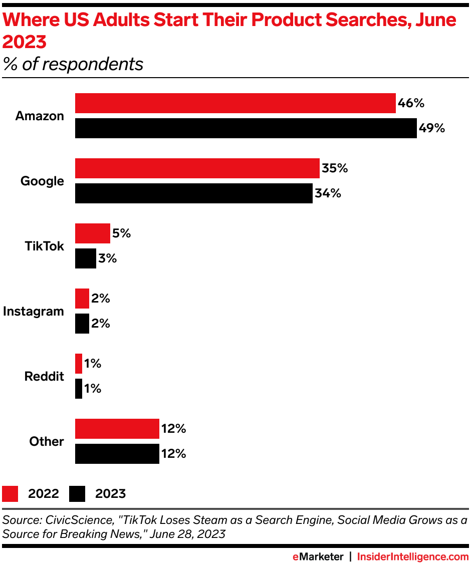 Social search takes off: While Amazon remains comfortably on top, TikTok is quickly climbing the rankings, helped by younger users’ affinities for social search.
