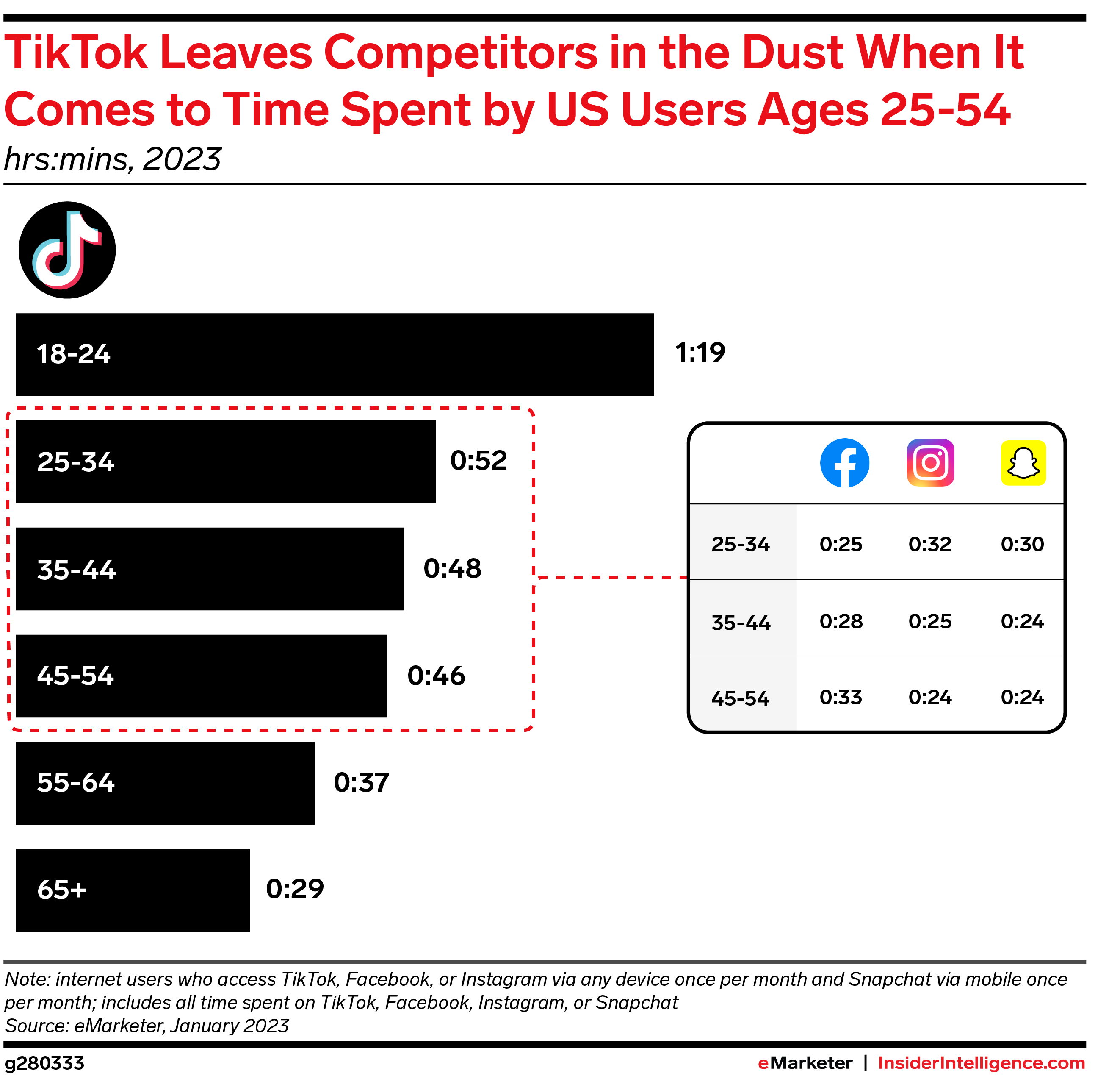 According to Insider Intelligence’s first-ever forecast for time spent on social platforms by age, TikTok users ages 25 to 54—largely the millennial and Gen X generations—will spend over 45 minutes per day on the app, well above time spent by 25- to 54-year-old users of other social platforms.