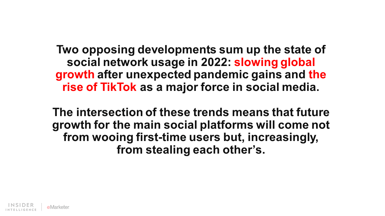 Two opposing developments sum up the state of social network usage in 2022: slowing global growth after unexpected pandemic gains and the rise of TikTok as a major force in social media. The intersection of these trends means that future growth for the main social platforms will come not from wooing first-time users but, increasingly, from stealing each other’s.
