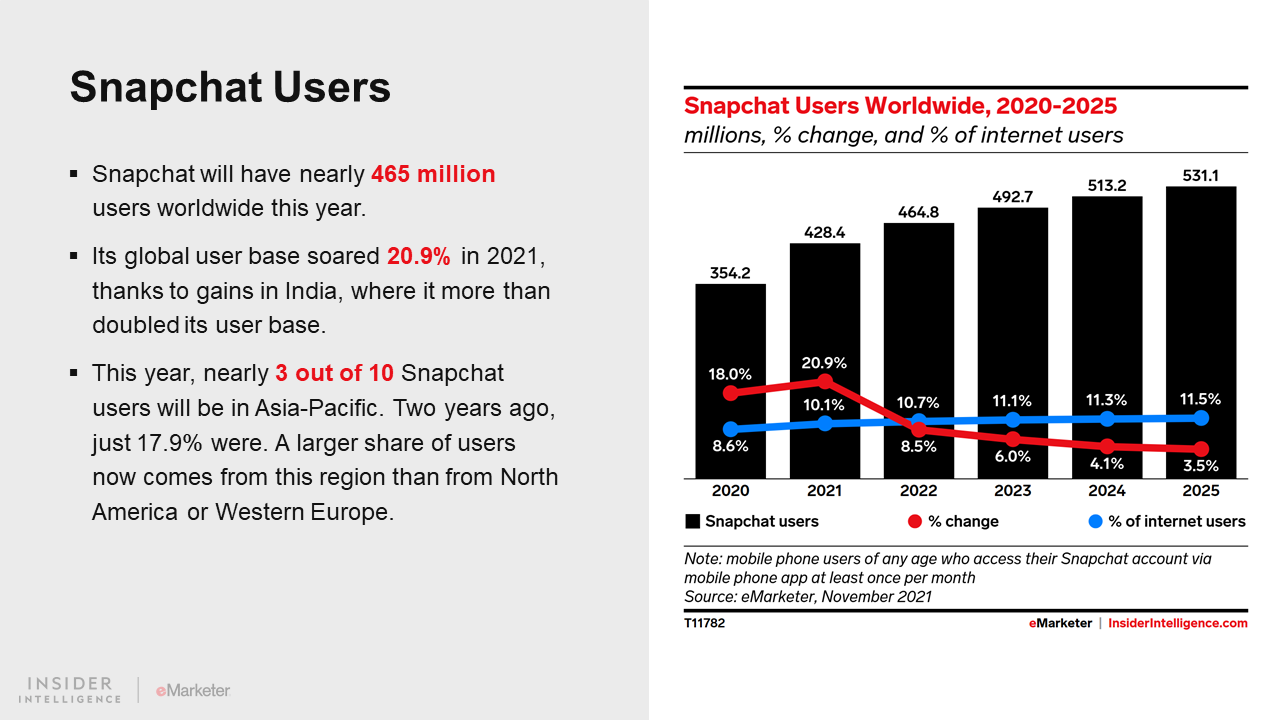 WHAT’S IN THIS REPORT? This report presents our latest forecasts for global social network users through 2025 and identifies the top usage trends for Facebook, Instagram, Snapchat, TikTok, and Twitter.