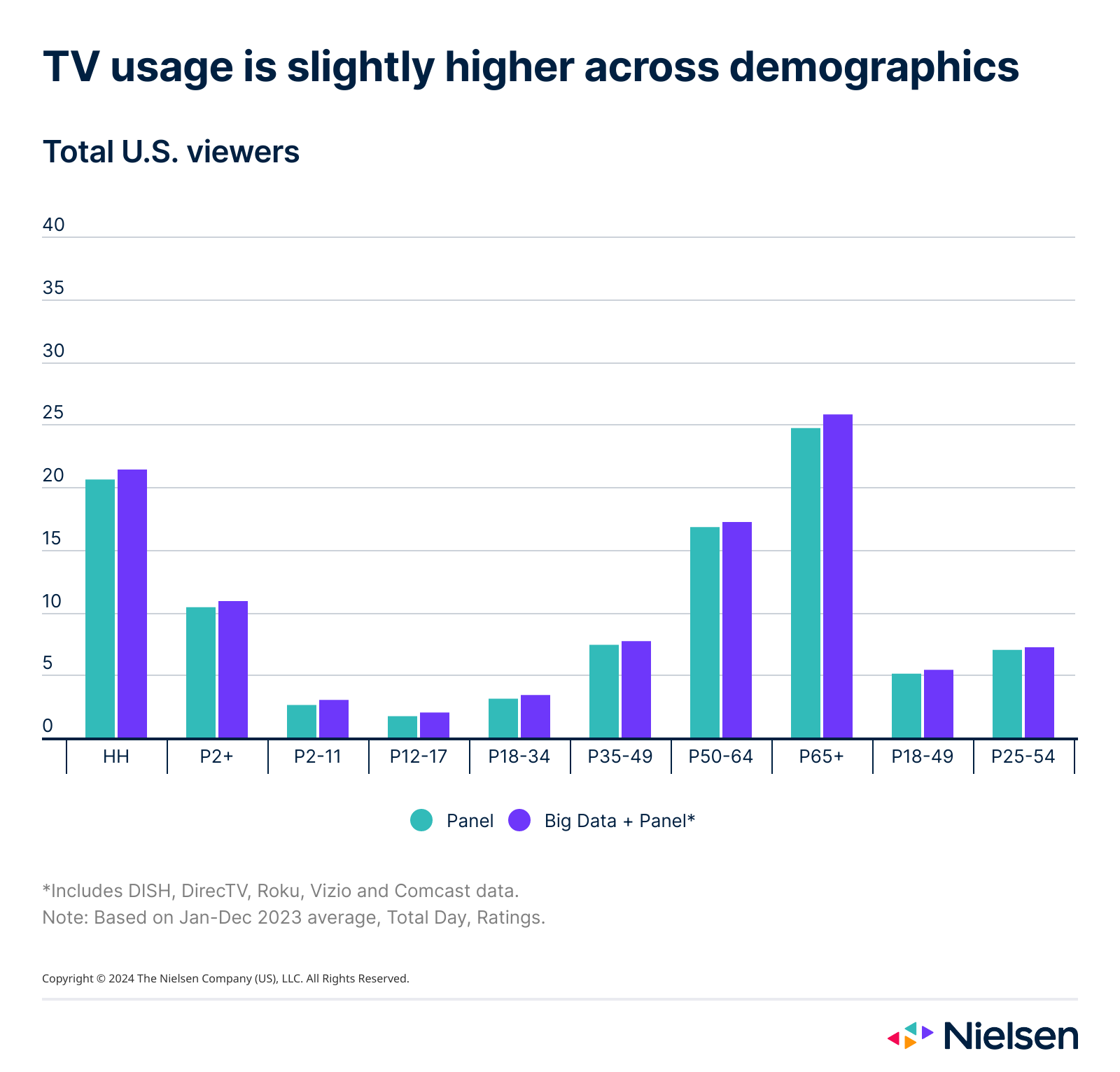 With Big Data + Panel, the total US households using TV in 2023 increased slightly across most age groups compared with National TV Panel data alone.