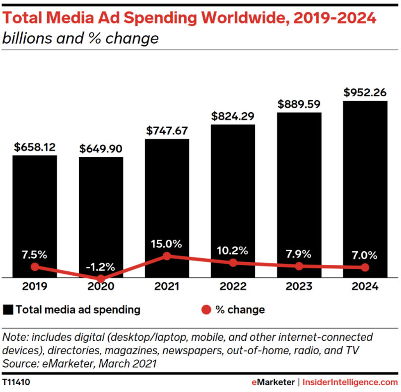 Total media ad spending worldwide will reach $747.67 billion, at a growth rate of 15.0%—the fastest since we began tracking the metric 10 years ago. By the end of 2024, spending will nearly reach $1 trillion. For context, it just crossed the $500 billion mark in 2016.