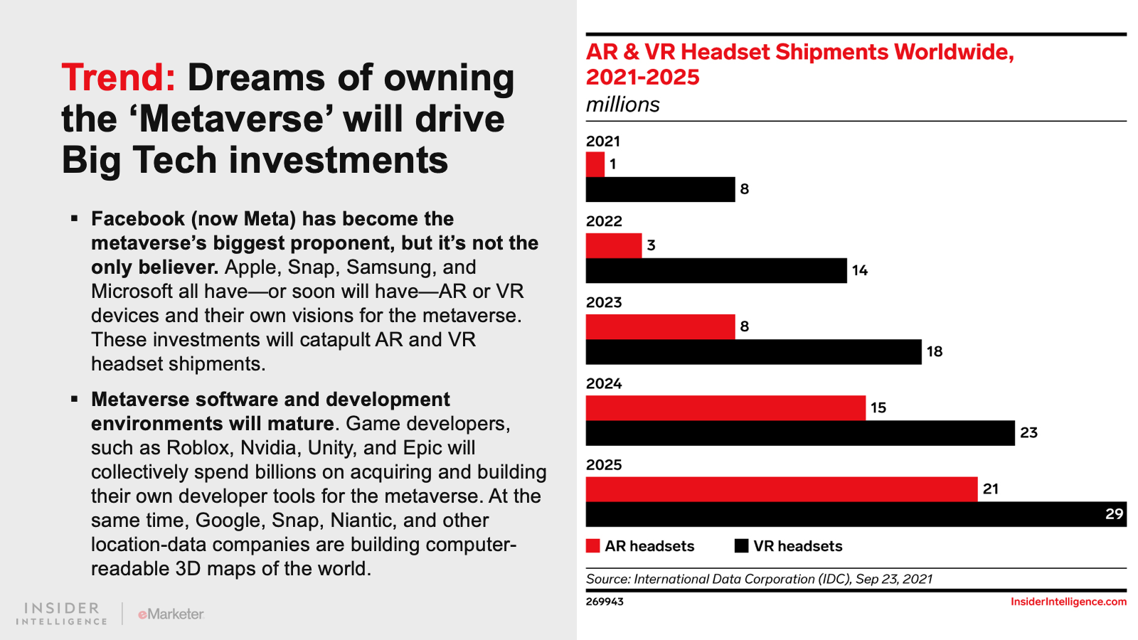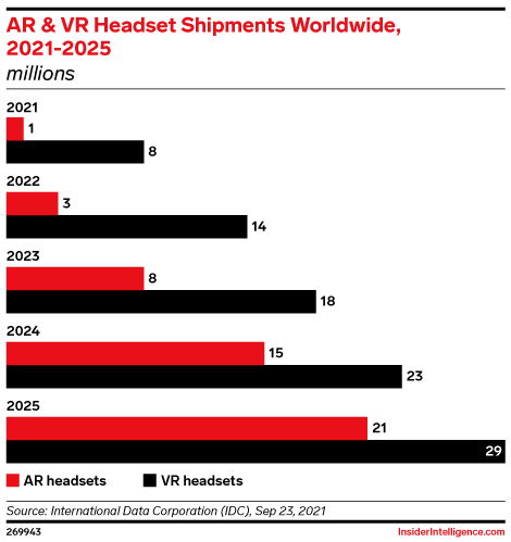 KEY STAT: Visions of the metaverse rely on widespread adoption of augmented and virtual reality (AR/VR) headsets, which are set to become much more common in the next four years.