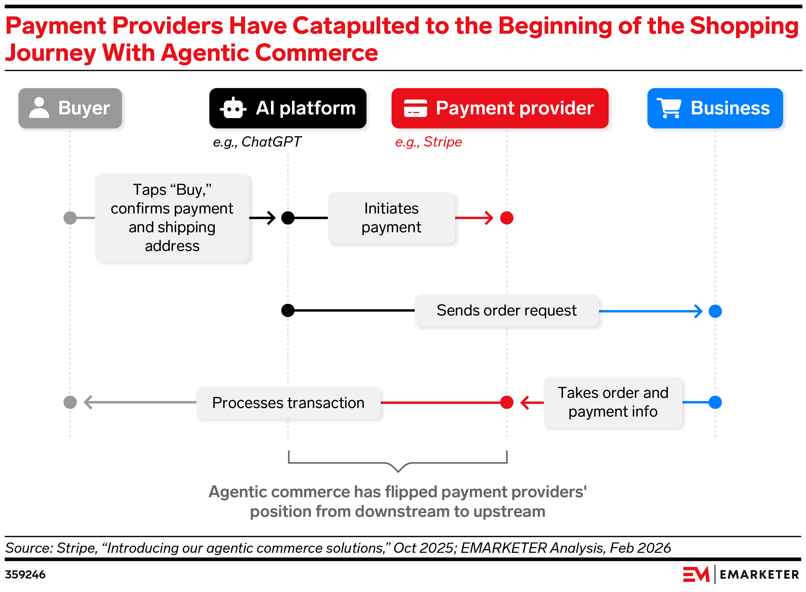 Payment providers’ position in the ecommerce funnel is reversing from downstream to upstream: In traditional ecommerce, merchants lead consumers to payment providers; in agentic commerce, consumers find merchants through payment platforms. This unlocks new power for payment platforms to wield, like gating merchant visibility.
