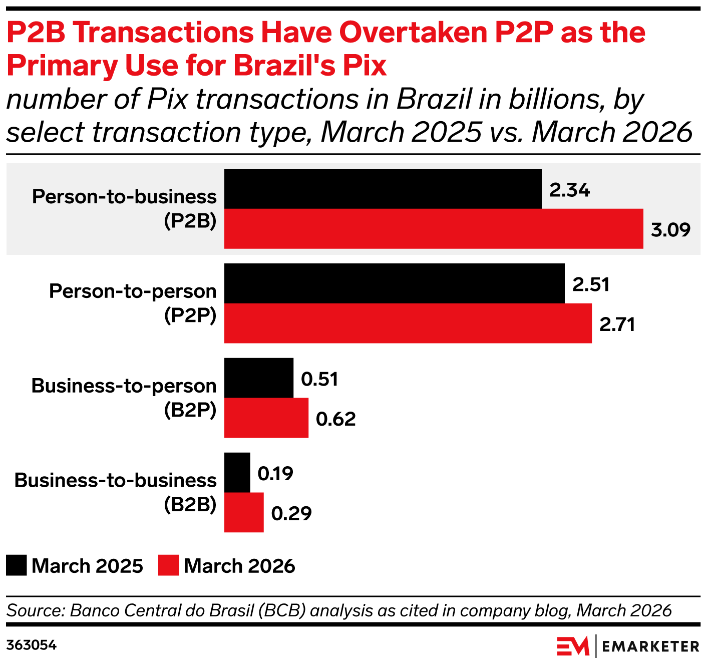 Key Stat: In Brazil, Pix’s primary use case is shifting toward everyday commercial payments, with the number of person-to-business (P2B) transactions reaching 3.09 billion in March 2026 and surpassing peer-to-peer (P2P) transactions, per Banco Central do Brasil.