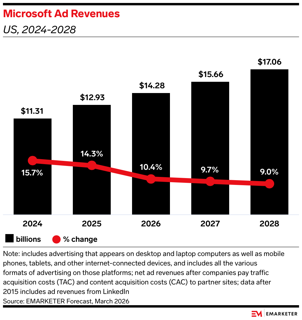 We forecast that Microsoft’s advertising business will continue its steady growth trajectory, reaching $14.28 billion in 2026, a 10.4% increase YoY. This ad revenue expansion complements the broader AI monetization strategy highlighted in Microsoft’s results, where Azure re-acceleration and AI adoption drove strong enterprise momentum.