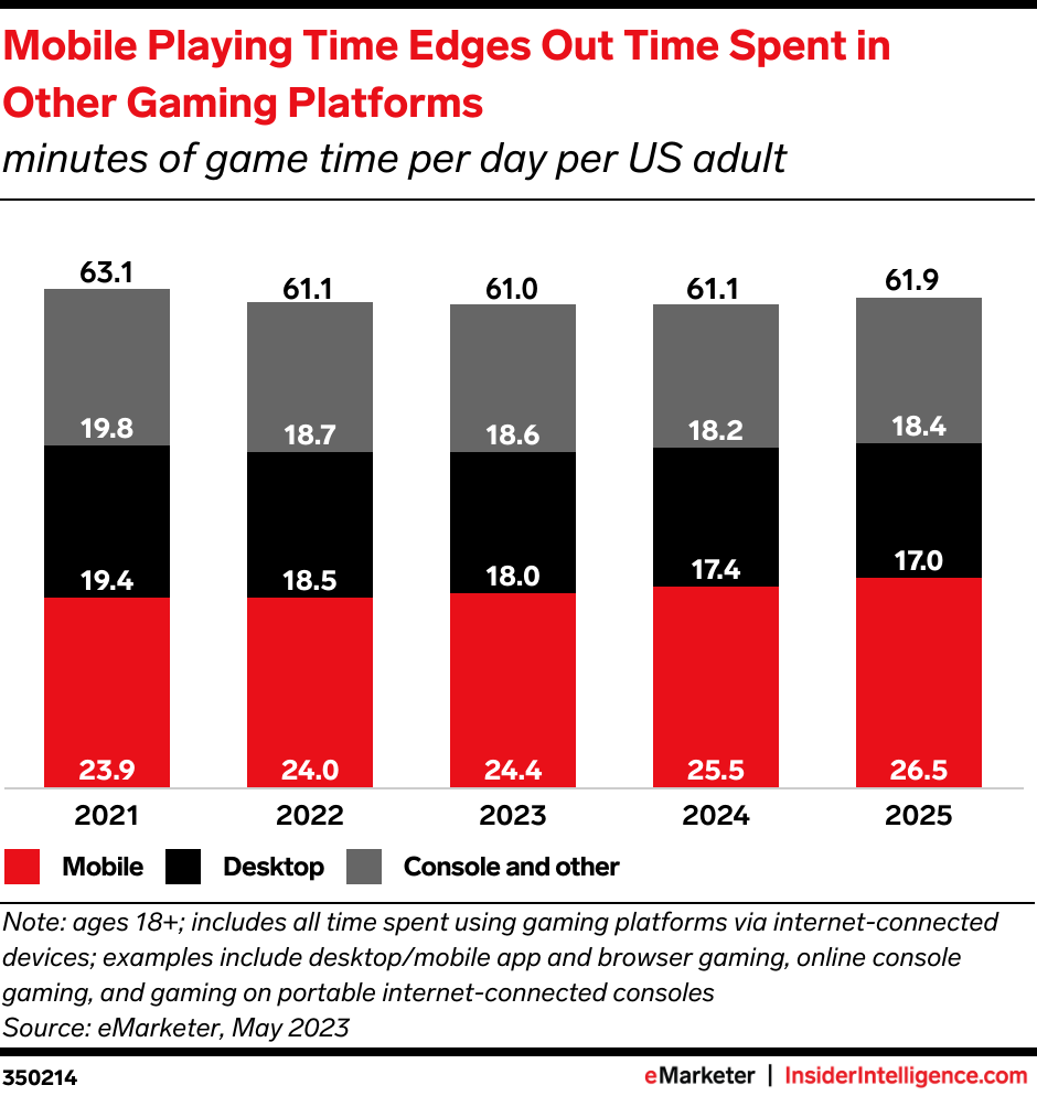 • Mobile games dominate in total users, but less so in time spent. In the US, there are nearly two smartphone game players for every PC, tablet, or console player. The difference in time spent is much narrower, though. We estimate that the average US adult plays mobile games 24.4 minutes per day, or 40.2% of their total time spent on video games.