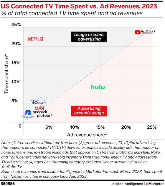 • While Netflix has the potential to expand ad revenues to meet its time spent share, the platform still faces the challenge of convincing advertisers to take a risk on a younger ad platform. Netflix’s US ad revenues will reach $1.03 billion in 2024, according to our forecast. That puts it ahead of the Disney+ ad tier, which launched around the same time and will see $0.91 billion in ad revenues next year, despite accounting for a smaller share of time spent.