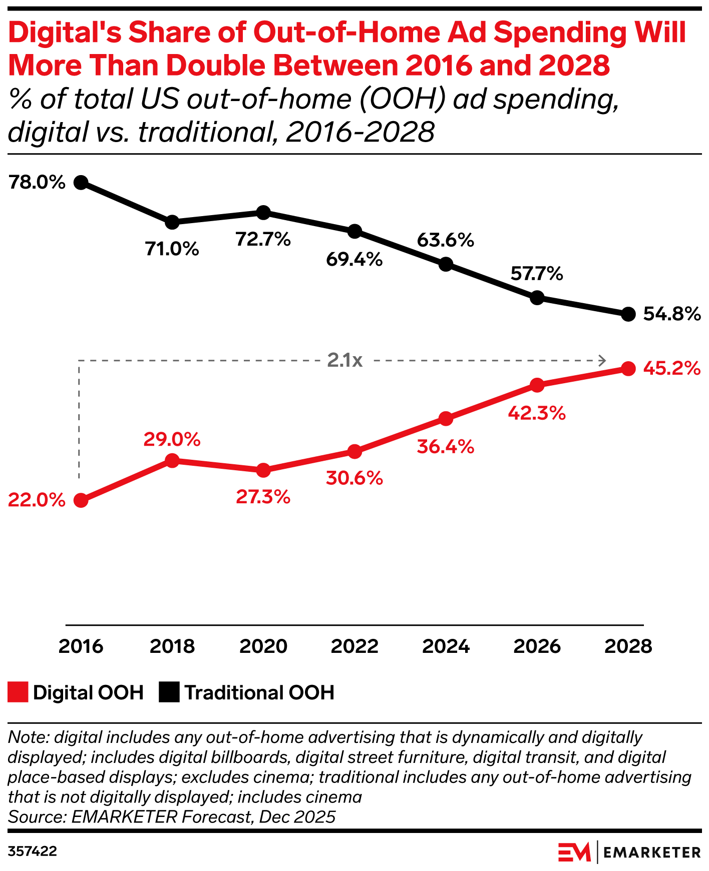 Digital formats are driving OOH's growth trajectory. US DOOH ad spending will reach nearly $3.6 billion in 2026, a 6.1% lift from 2025, per our forecasts. Programmatic DOOH will cross $1.23 billion by 2026, while total US OOH ad spending is forecast to reach $10.48 billion by 2028. DOOH's share of the total OOH market will climb to 45.2% by 2028, up from 22% in 2016.