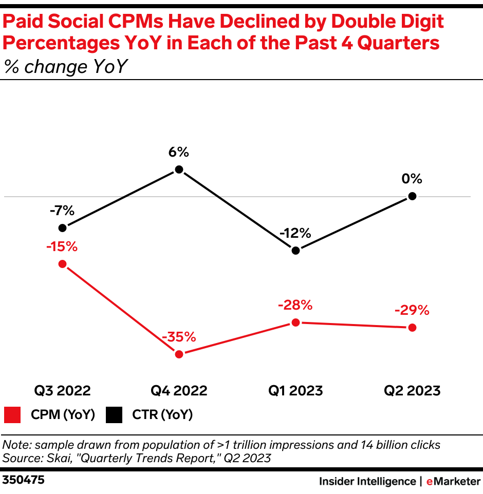 KEY STAT: Thanks to a flood of new inventory, some of it in unfamiliar places, CPMs and CTRs have been either flat or declined YoY in each of the past four quarters—with CPMs dropping 29% in Q2 2023 alone—according to Skai.