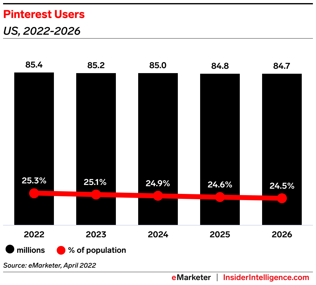 The number of users engaging with shopping surfaces on Pinterest has grown more than 215% year over year, according to SVP of engineering Jeremy King—impressive considering the platform’s user growth has been stagnant. Our forecast has US Pinterest users actually dropping from 85.4 million in 2022 to 84.7 million in 2026, though the platform will pick up users in key European markets during that time frame.