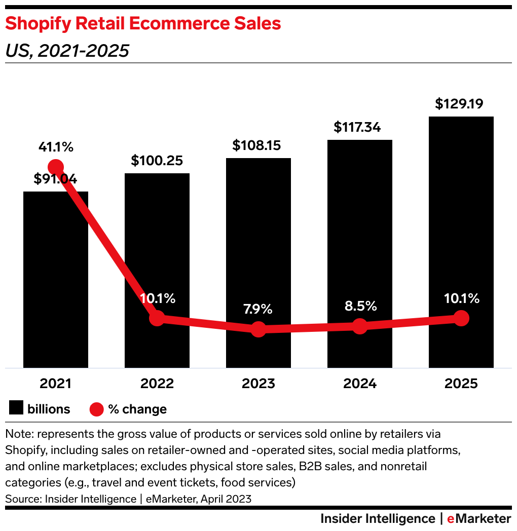 • Retail ecommerce sales on Shopify will grow 7.9% this year, slower than total US ecommerce sales.