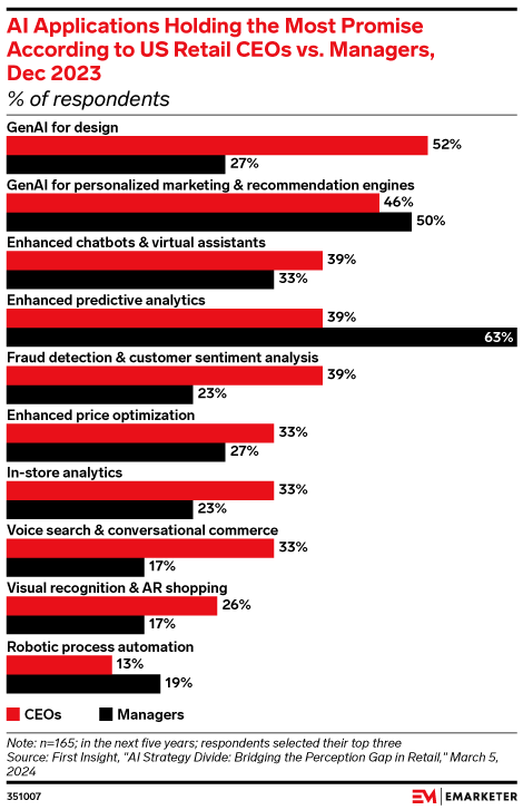 Key Stat: Retail CEOs and management teams are most aligned in identifying genAI for personalized marketing and recommendation engines as a promising application of AI technology, at 46% and 50%, respectively, per First Insight.