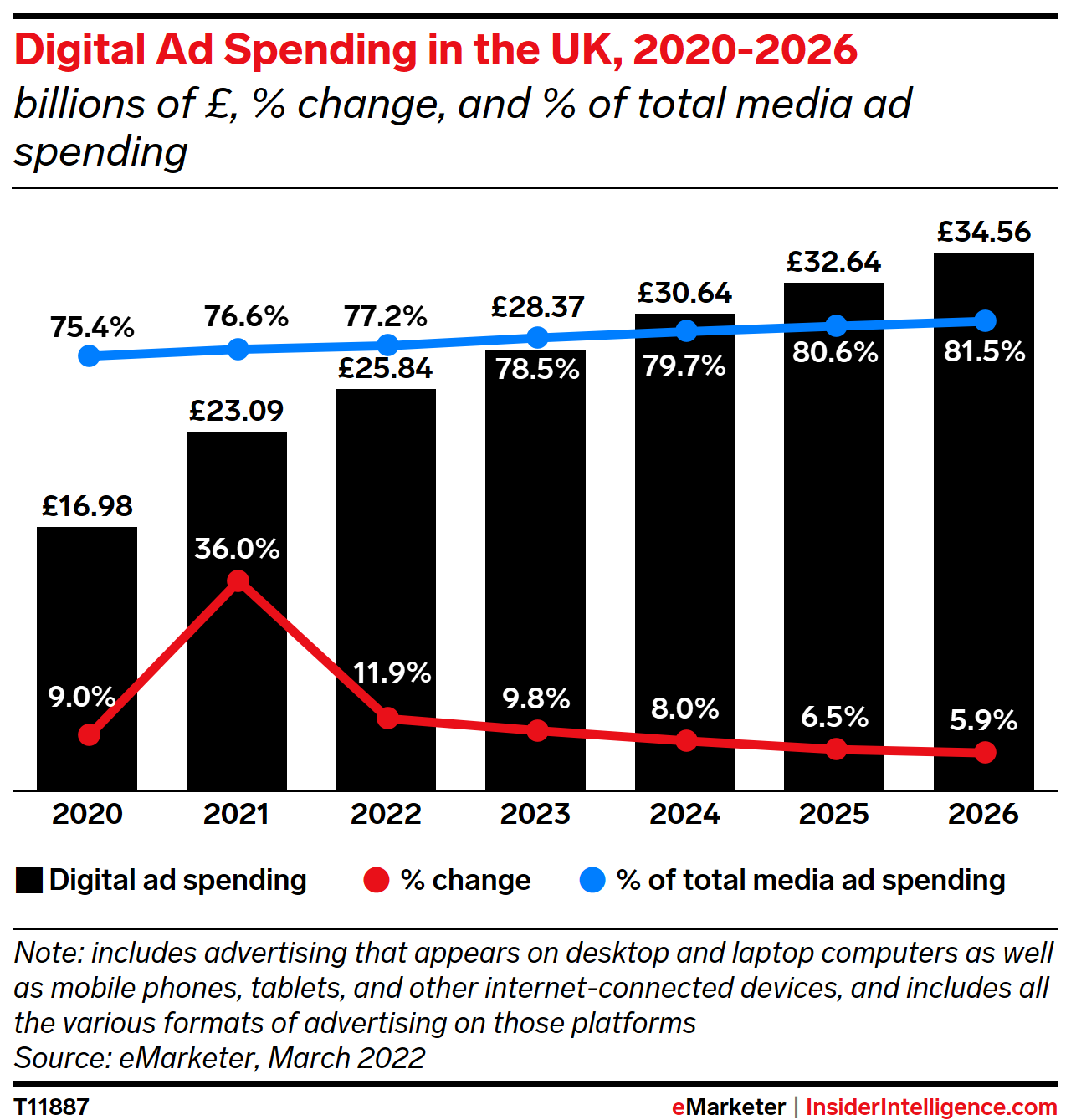 KEY STAT: Digital ad spending will see growth of 11.9% this year—down significantly from the remarkable 36.0% surge in 2021, but a strong rise nonetheless. Growth will then slow through the end of our forecast period in 2026, when spend will approach £35 billion ($48.13 billion).