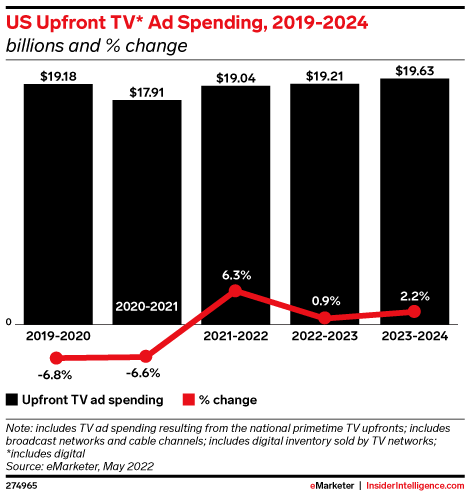 KEY STAT: US TV upfront ad spending will be flat at $19.21 billion in 2022–2023.