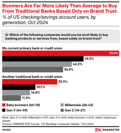 Key Stat: Baby boomers are almost twice as likely as Gen Zers to buy banking products from their primary bank based on brand trust alone. Bank marketers must account for these generational differences when building their acquisition and retention strategies.