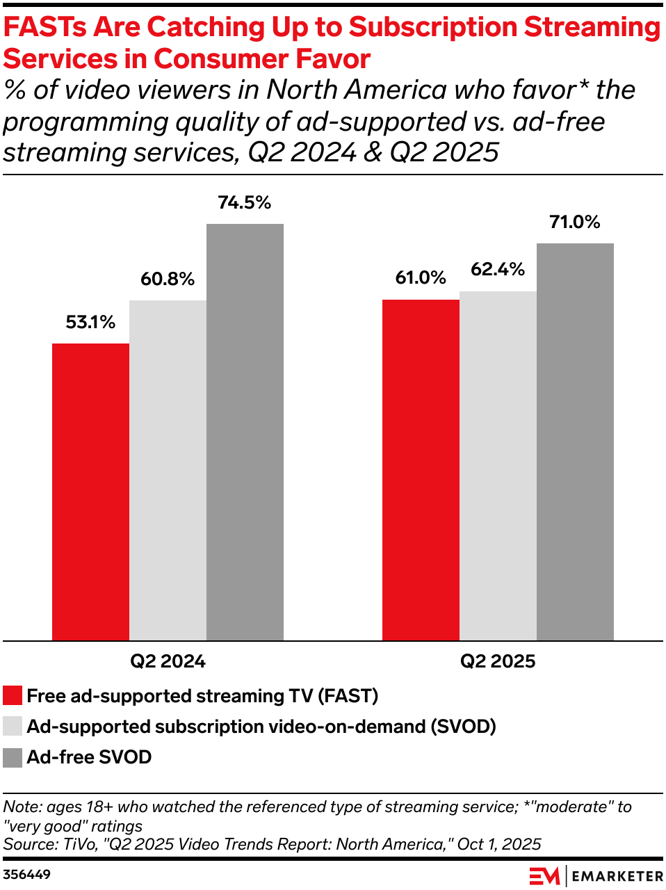 Key Stat: Free ad-supported streaming TV (FAST) services gained nearly 8 percentage points YoY in perceived quality, according to TiVo.