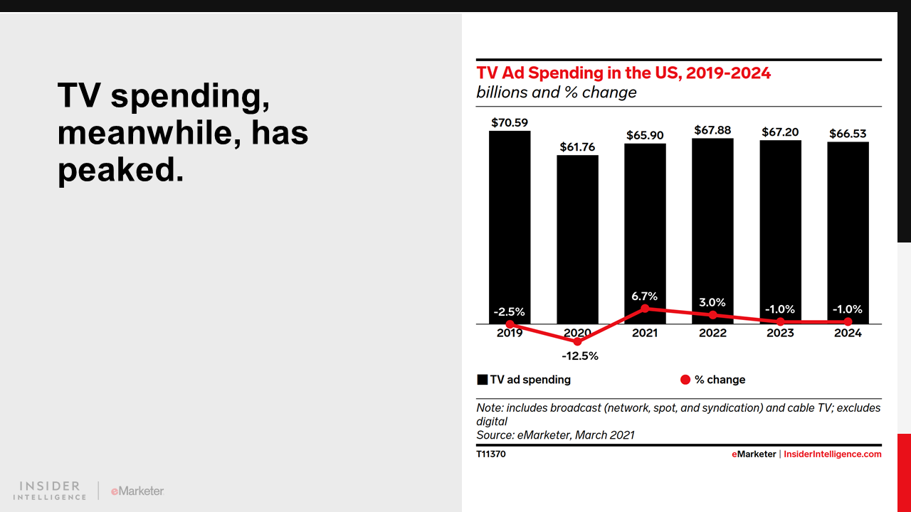 We forecast that US digital ad spending will increase 25.5% this year, the fastest growth rate since 2018, as the ad market and wider economy continue recovering from the pandemic. We estimate total media ad spending will rebound 18.0% this year after a flat 2020. That includes a 5.2% increase in traditional media ad spending, led by a partial recovery for TV.