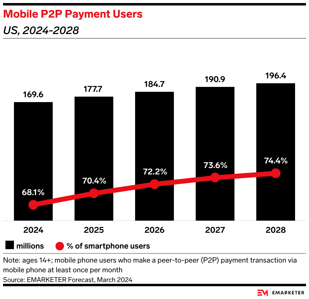 Key Stat: Nearly three-quarters of US smartphone users will send money over P2P payment apps by 2028, per our forecast. Attracting Gen Z and Gen Alpha will be critical for apps to keep growing in such a saturated market.