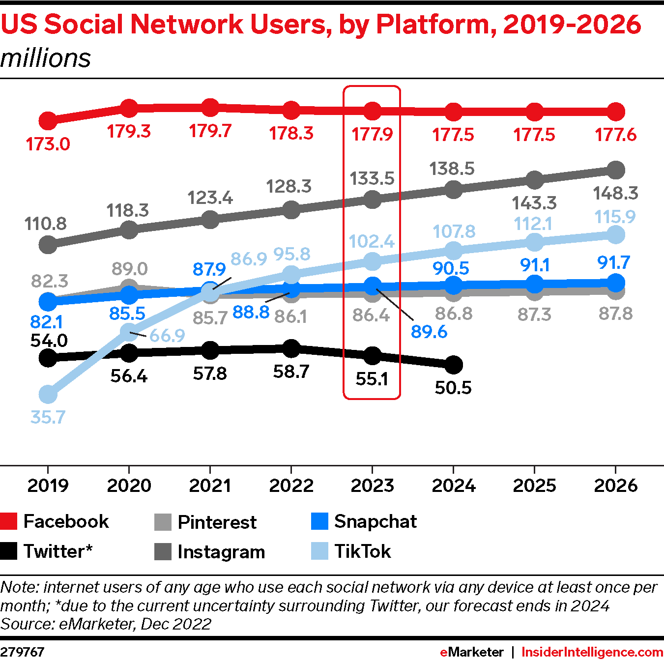 KEY STAT: In 2023, TikTok will become the third social network, along with Facebook and Instagram, to surpass 100 million monthly US users—provided US lawmakers or regulators don’t grind its growth to a standstill.