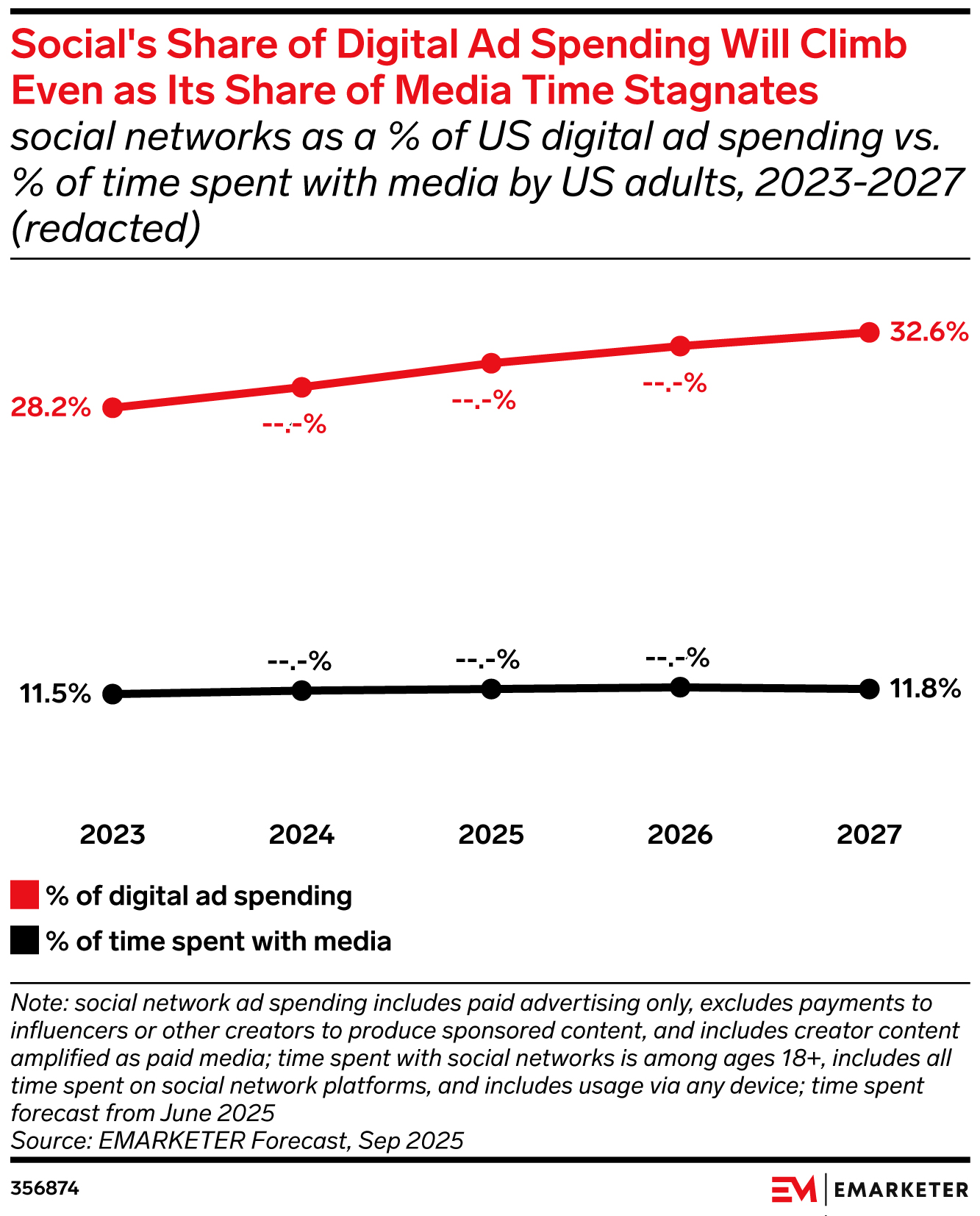 Key Stat: Social media’s share of time spent with media will peak in 2026, then begin declining in 2027. But its share of digital ad spending will continue climbing, reaching 32.6% in 2027.