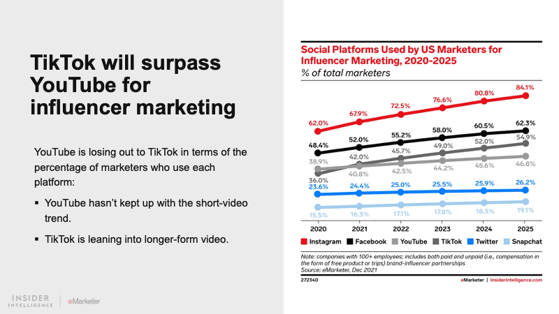 KEY STAT: More US marketers now use TikTok than YouTube for influencer marketing, but TikTok still sees significantly lower usage than Instagram.