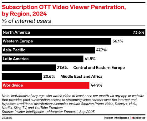 Key Stat: On a global scale, sub OTT has become extremely popular, with 44.9% of worldwide internet users set to watch in 2024. However, regional penetration is quite disparate, and in some geographies, sub OTT is less common.