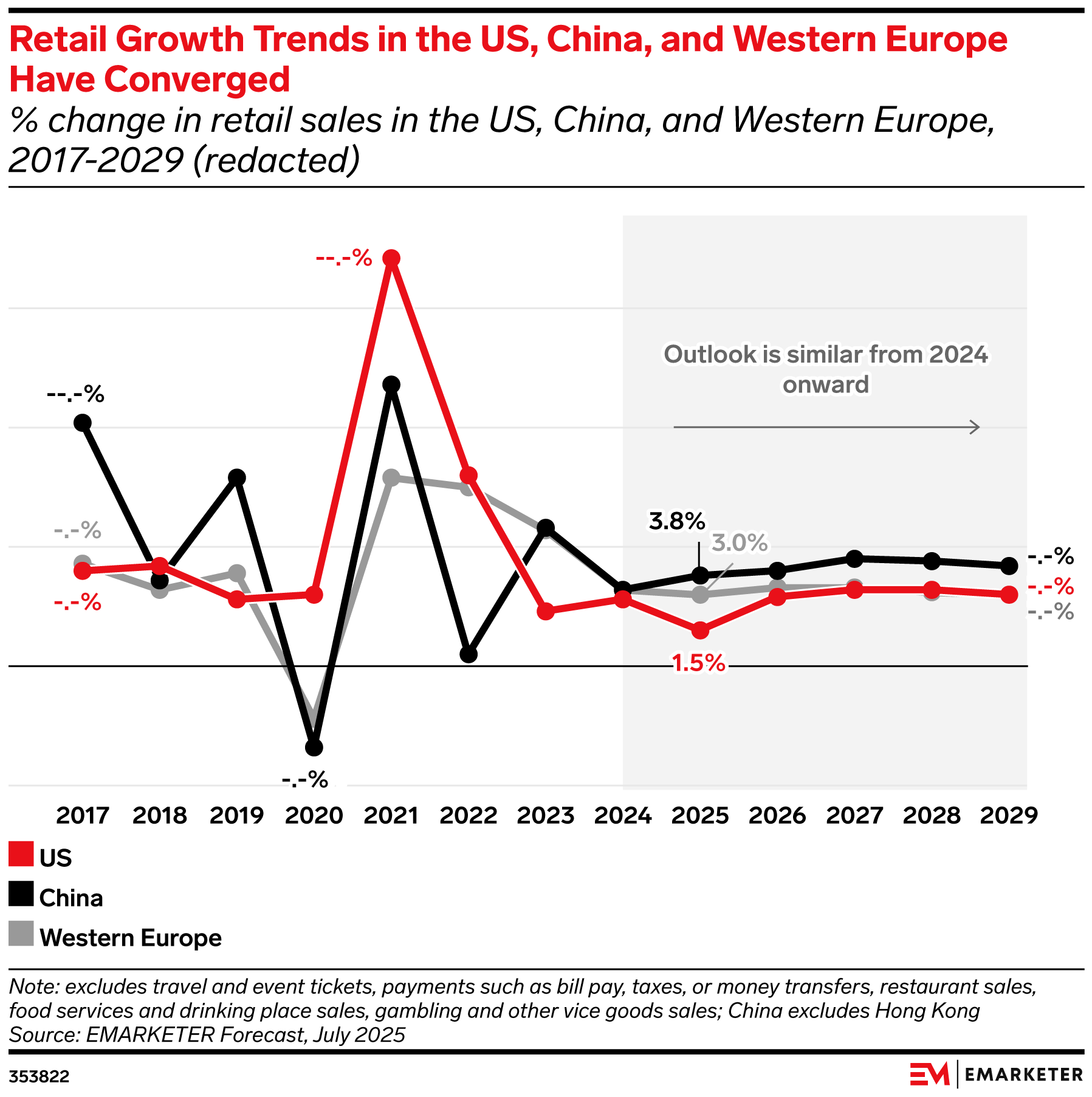 Key Stat: In 2025, retail sales will increase 1.5% in the US, 3.0% in Western Europe, and 3.8% in China. Such similar results among the three megamarkets were rare in previous decades, but they’ll be commonplace going forward.