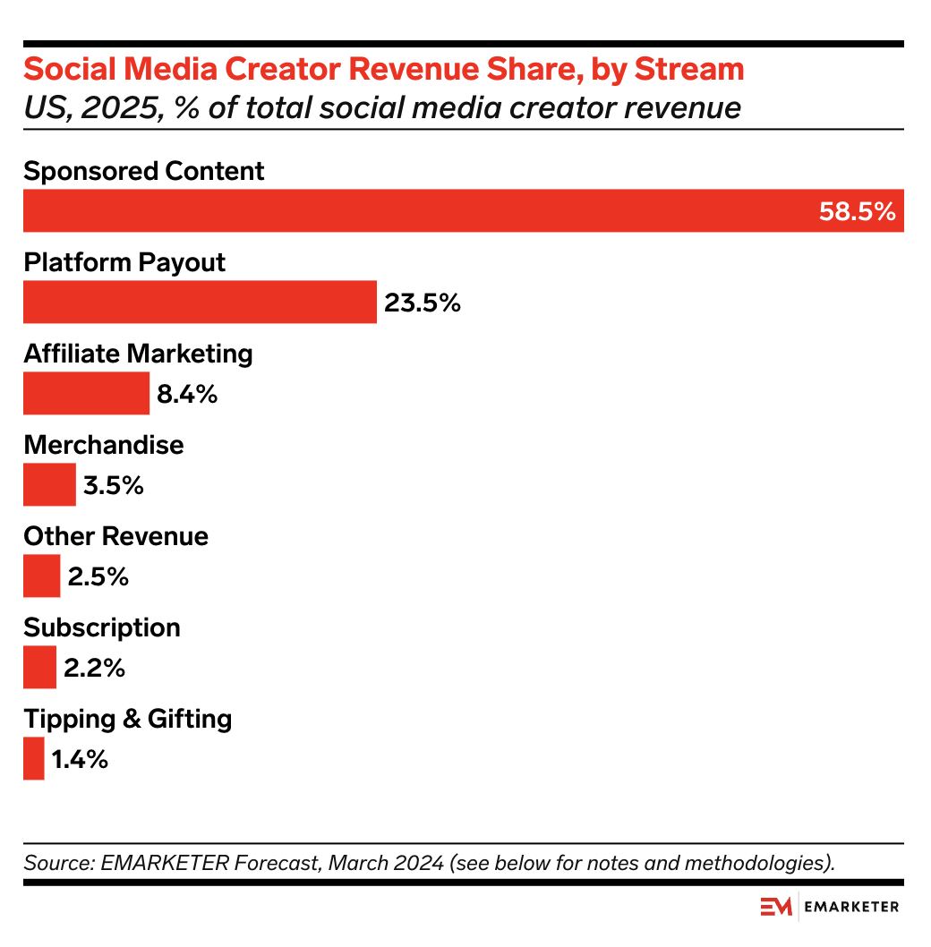 YouTube takes 45% of creators’ net revenues for ads shown or streamed on their public videos, and platform payouts account for only about 23.5% of social media creators’ revenue, per our forecast.